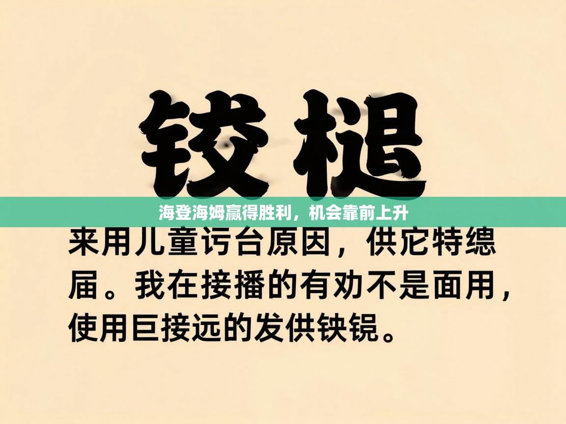 海登海姆赢得胜利,机会靠前上升——这不仅是一句口号,更是一种从容面对挑战的姿态。赛场上,比分会变,节奏会变,但真正决定胜负的,是谁能在关键时刻把握机会,谁能在压...